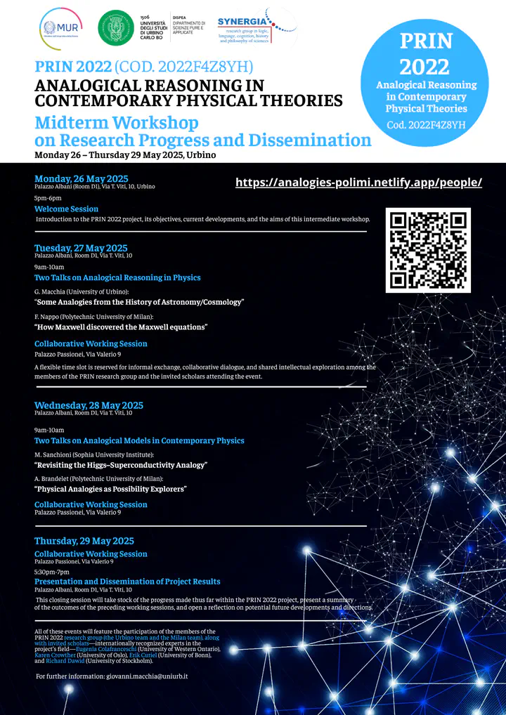 A session dedicated to the role of analogy in theoretical modeling. The session will feature two brief presentations by members of the PRIN research group (the Urbino team and the Milan team), followed by a collective discussion aimed at exploring and critically assessing the methodological implications. Discussants: Eugenia Colafranceschi (University of Western Ontario), Karen Crowther (University of Oslo), Erik Curiel (University of Bonn), and Richard Dawid (University of Stockholm). This session will be held at Palazzo Albani (Room D1), Via Timoteo Viti, 10, Urbino.